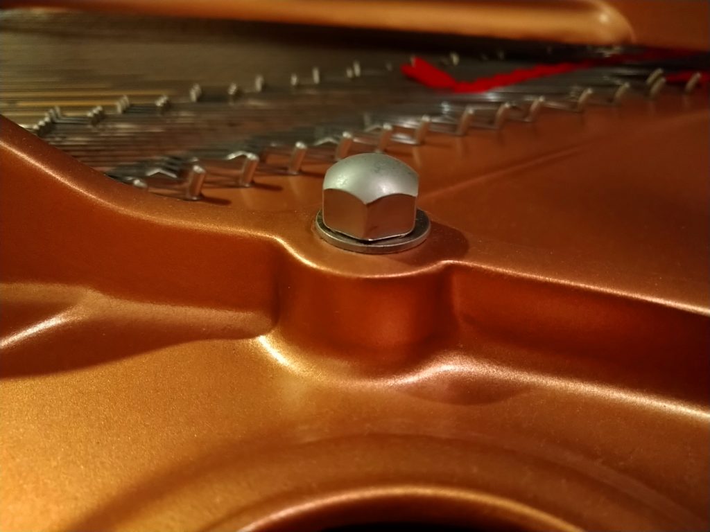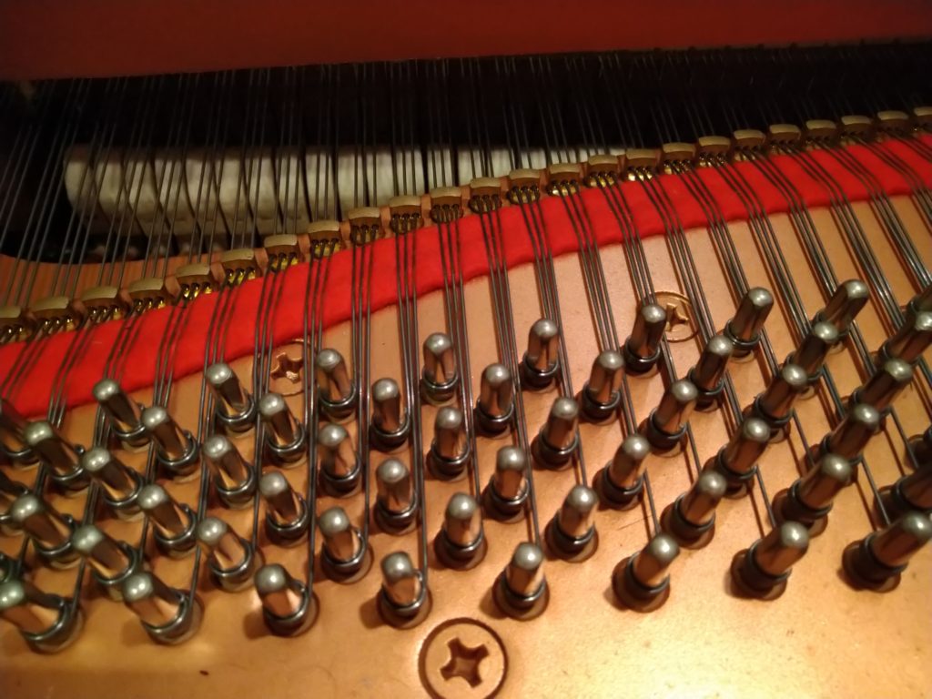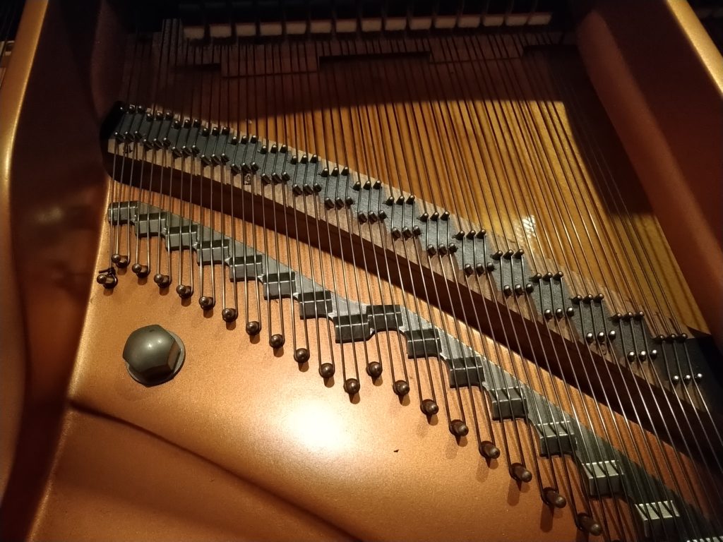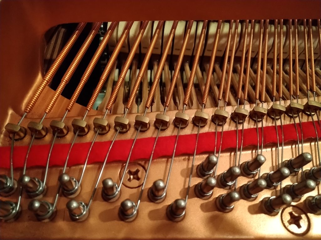 これは昔のモデルにはなかったそうですが、通常ハンマーが叩いて振動する部分(有効弦)の先に、余りの弦を利用して倍音を鳴らす部分が付いているのです!