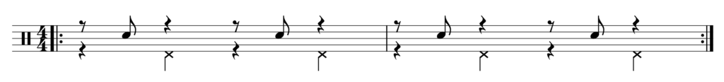 それではこれからはメトロノームにウラを取ってもらい、自分が色々なリズムを鳴らすことで、ぶれないパルスを獲得するトレーニングに入る。今回は8分音符を題材にする。まずは下記譜例から。毎度のことだが、可能な限りイーブン(均等)に、正確に演奏することに集中してほしい。そしてメトロノーム君は2拍・4拍であることを忘れず、小節の頭を見失わないように。
