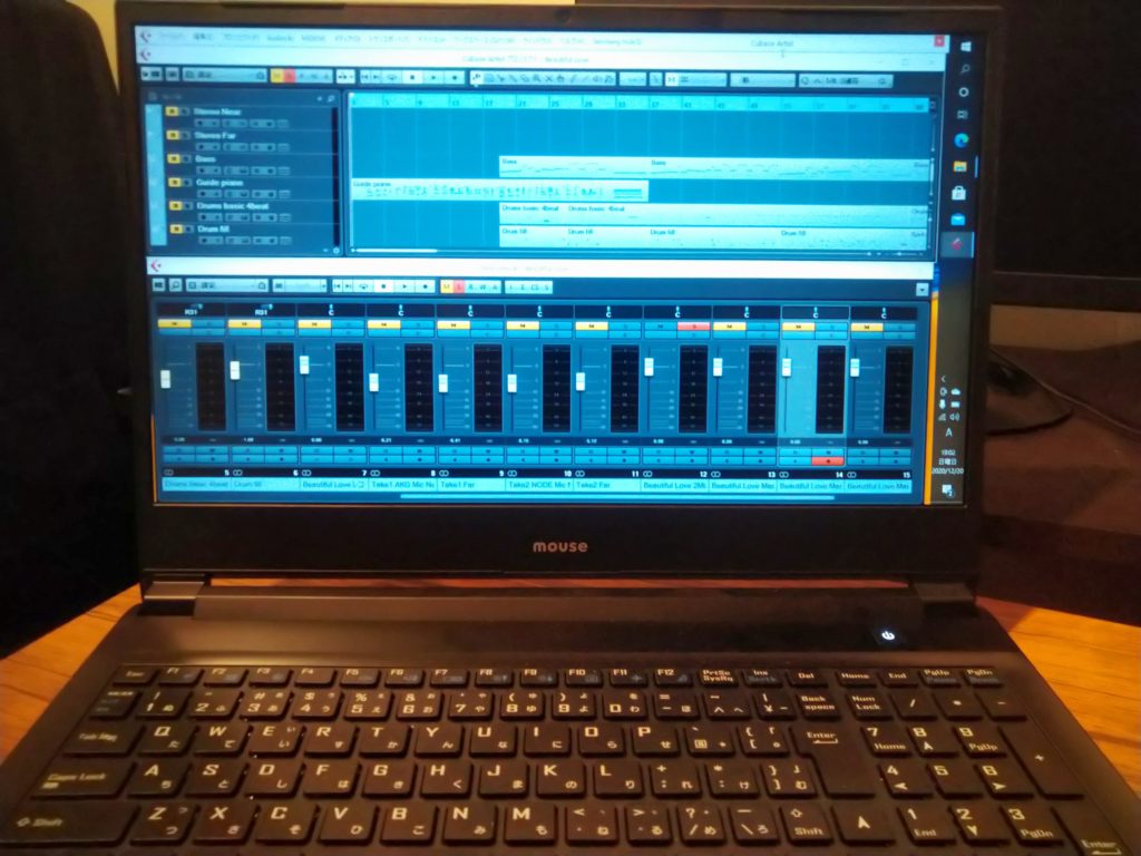 こんな感じですね。ちょっと小っちゃくて見づらいと思いますが、縦にベース、ドラム、ピアノなどパートのトラックが並んでいて、横が時間軸になっています。音データを打ち込んだり、録音のデータを配置していくとあたかも楽譜を書いていくように曲が作られていきます。ちなみに、この画面の上の4トラックはMIDIデータといって私がベースやドラムの音を一つ一つ入れている(打ち込んでいる)ものです、下の2つのトラックは波形に見えると思いますが、これが私が実際に生のピアノを弾いてレコーディングしたデータです。