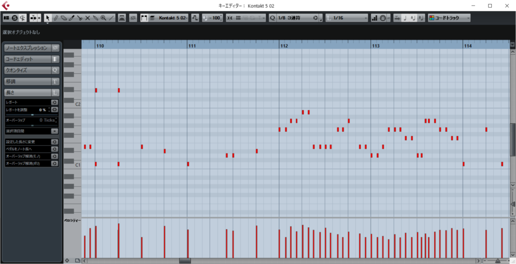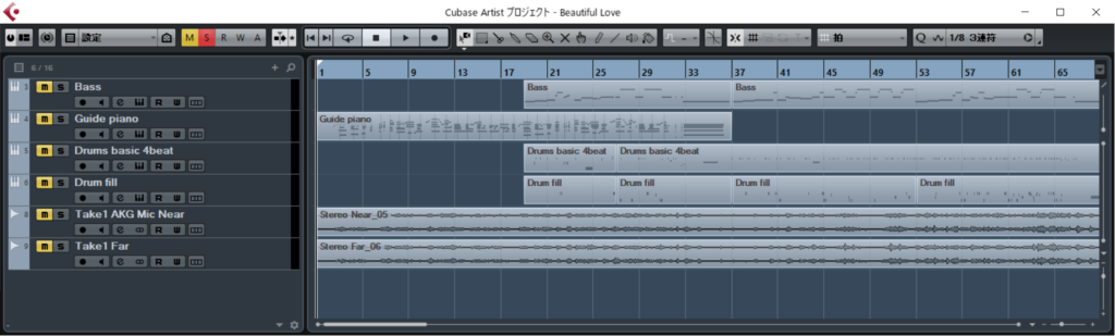 こんな感じで音の一つ一つが並んでいるのが分かると思います。ちなみにこの画像は、今回のBeautiful Loveのドラムソロの一部です。ハイハット、スネア、タムタム、バスドラムといったそれぞれの音を時間軸の上に並べている作業です。