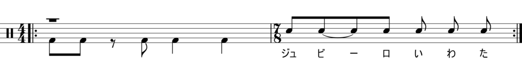 だが、よく聞いてほしい。2小節目の「ジュビーロいわた」は最後の8部休符がほとんど省略され次の小節が始まっている。