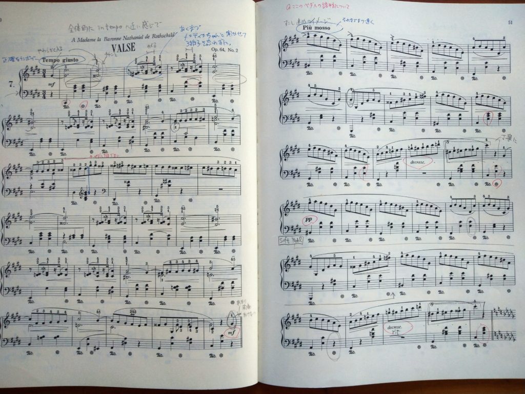 ショパンのワルツ7番。1番の「大円舞曲」、6番「子犬のワルツ」と並んでとても有名な一曲ですね。ピアニストの大半から支持を集める名曲ではないでしょうか。私もの子供のころから大好きな一曲です。写真は私が実際に使っている譜面なのですが、このワルツ集の楽譜、小学生の頃からうちにあったもので、歴代の書き込みがそのまま残っています。そして、今も色々気になったことを書き込んでいます。